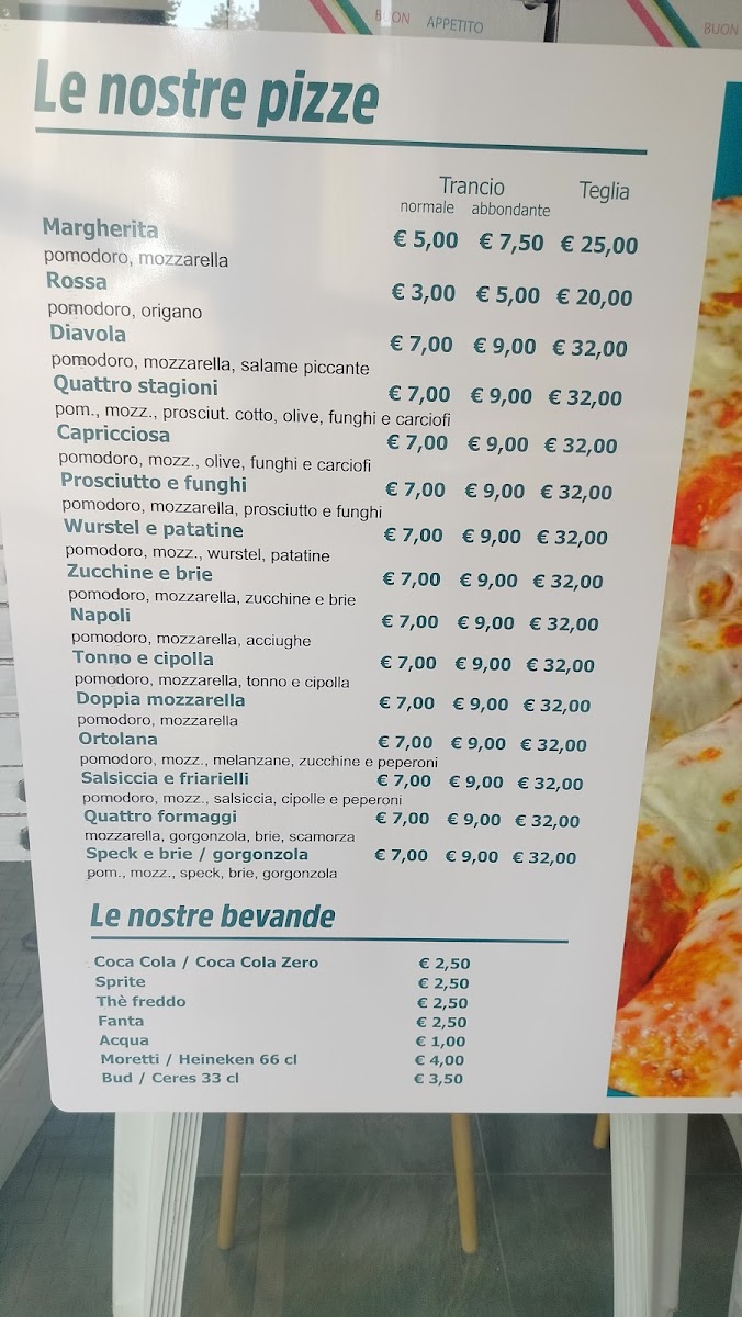 Introducing the menu at Pizza al trancio da Bea, a hidden gem located in the heart of Rozzano, Italy. Here, pizza is not just food; it's an experience tailored to please every palate. The menu boasts a delightful assortment of freshly baked, flavorful pizzas, each slice reminiscent of its iconic counterpart from the famous Spontini chain.